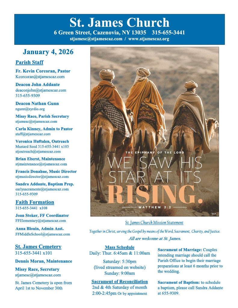 Do you prefer a weekly e-Bulletin from St. James sent to your email inbox? If so, send an email to stjamessite2015@gmail.com to request a weekly subscription.